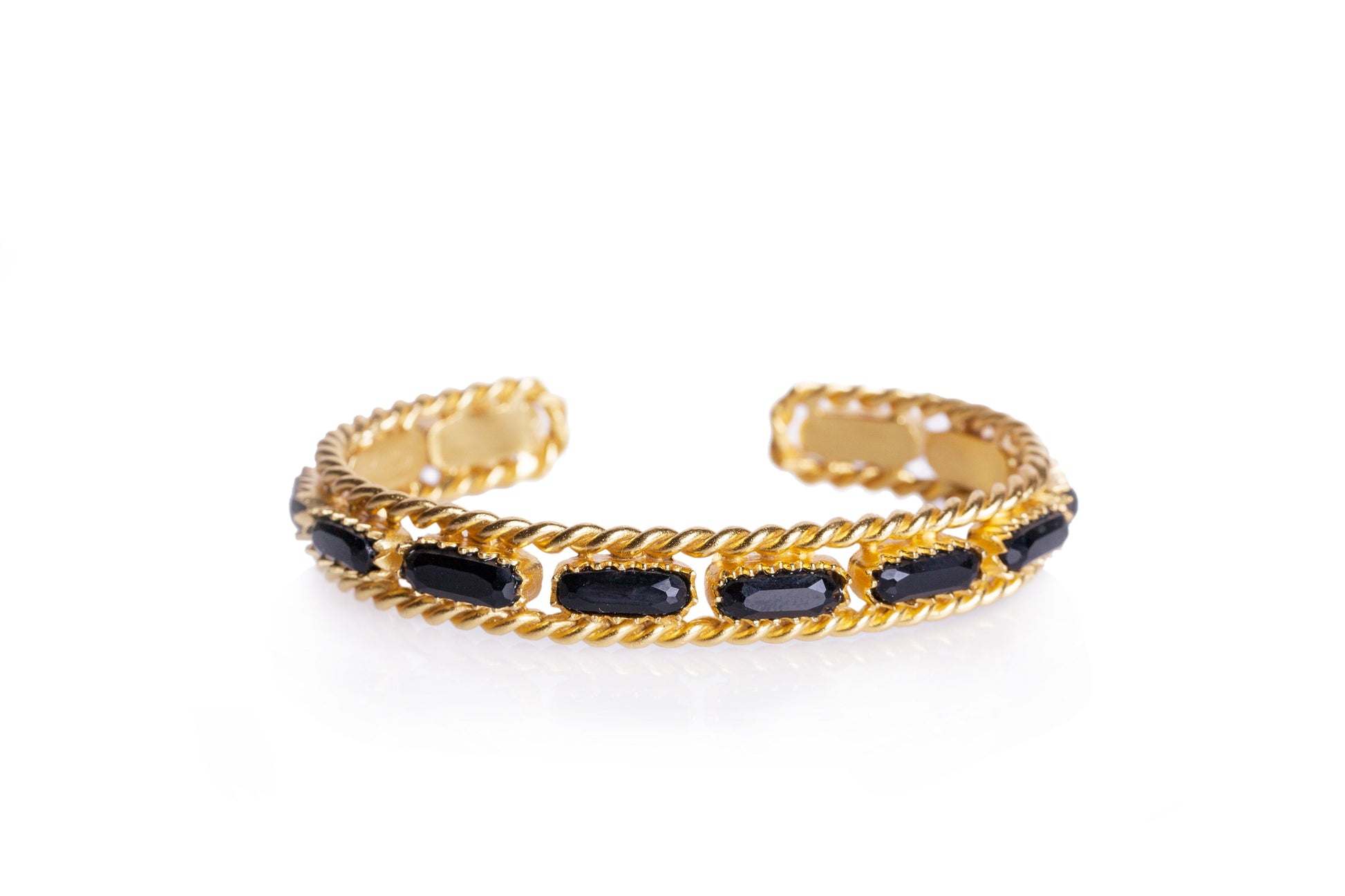 Our Cable Bangle is a great piece to add to your bracelet collection. The bangle is 18K gold plating over hypoallergenic and nickel free brass and features a chain texture with black onyx stones running along the center. You can stack this black onyx bangle with other bracelets (like our Studded Bangle) or simply wear it alone.